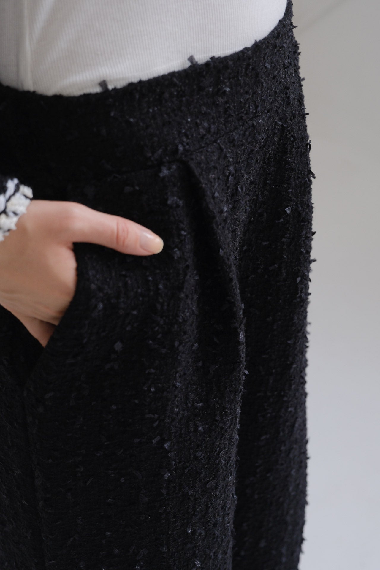 ツイードジャケットとのセットアップはもちろんですが、カットソーやブラウス、ニットやスウェット、、、どんなアイテムとも合わせていただけます。